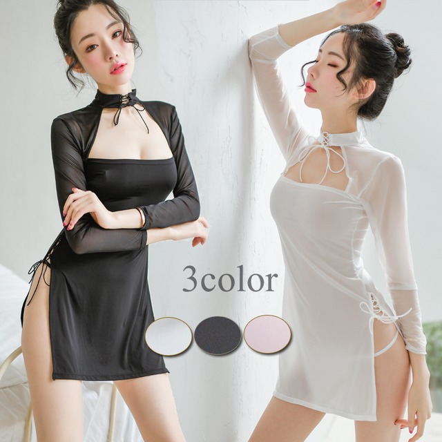 【即納】長袖 チャイナドレス風 ミニ丈ワンピース&Tバック